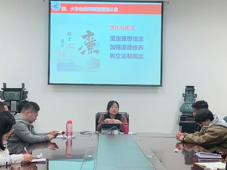 党委副书记彭蓉以《植廉于心、践廉于行,扣好人生第一粒扣子》为题,为部分研究生和学生会的党员干部讲授了一堂廉洁教育党课,本次党课由院团委书记、学生辅导员汪钰成老师主持。