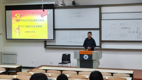 本科生一支部和本科生二支部联合举办主题党日活动,学习贯彻党的十九届五中全会精神。本次活动由本科生二支部党支部书记、学生辅导员黄佛保老师主持,学院全体本科生党员参加了此次主题党日活动。