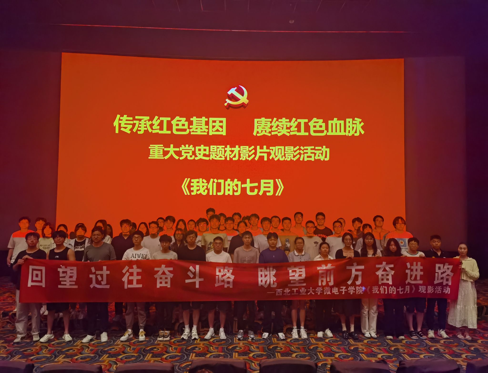 以“回望过往奋斗路,眺望前方奋进路”为主题组织师生党员、发展对象、入党积极分子观看重大党史题材影片《我们的七月》。激励广大师生铭记历史、缅怀先烈,将爱国热情和报国之志转化为实际行动,为实现中华民族伟大复兴的中国梦不懈奋斗。