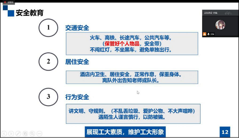 在安全教育部分,队长从交通安全、居住安全、行为安全三个角度出发,对出行交通规则、住宿地点防偷防窥、景点具体行为守则等方面进行了极为详细而全面的归纳与提醒,并在许多细节处进行了反复的强调。带队老师汪钰成也希望队员们在实践过程中注意个人行为守则,展现工大素质,维护工大形象。最后,队长进行了实践总结,老师、队员们对实践内容也再次进行了热烈的交流与讨论。