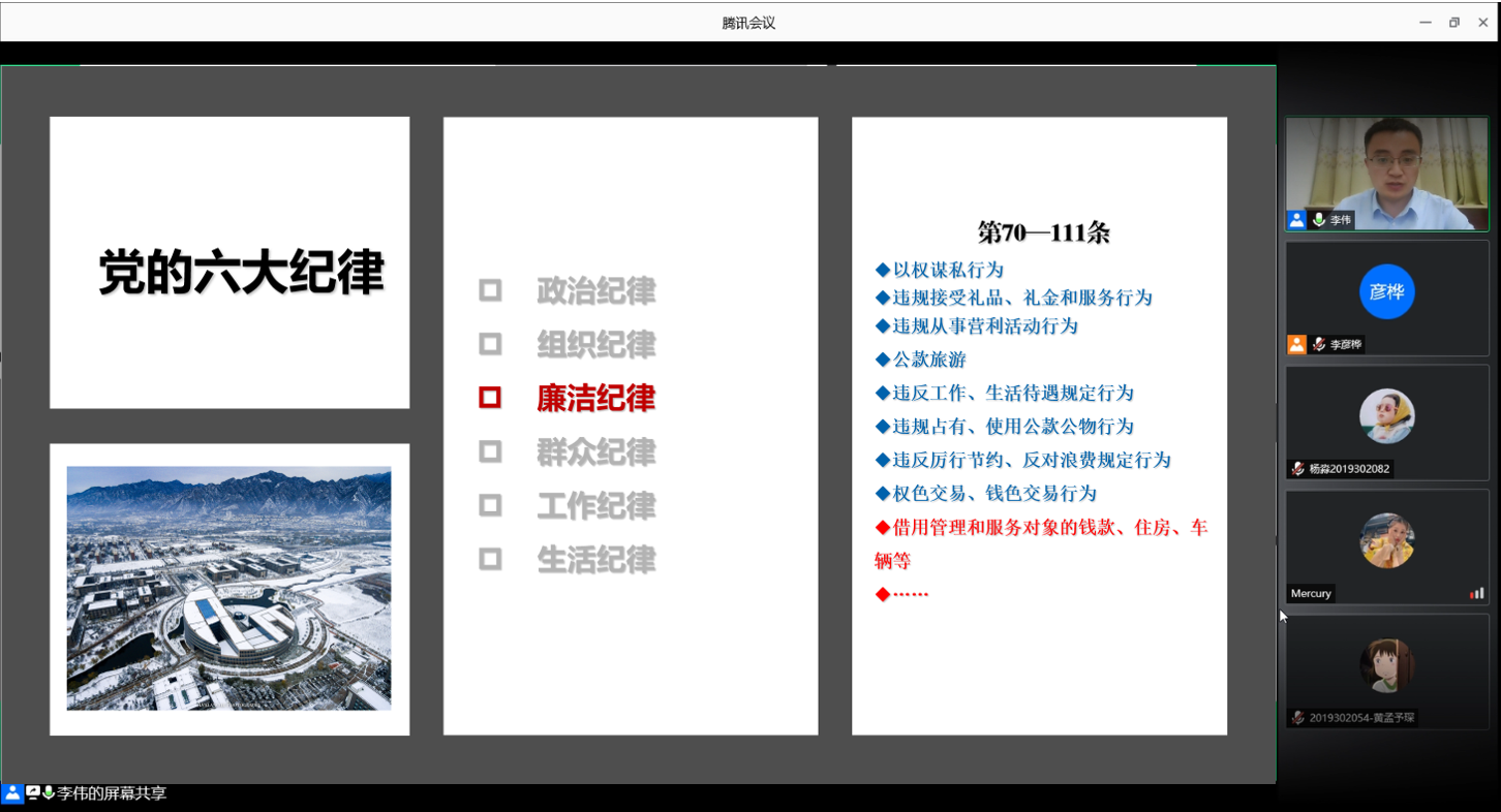 团委于2020年6月21日为电子信息类12-15班的所有团员在线开展了 “廉洁诚信,从我做起”主题教育团课,向同学们讲解团学青年和学生骨干在日常学习和生活中所应遵守的廉洁品质。