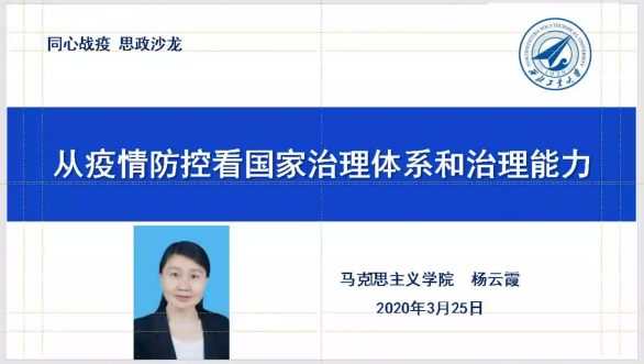师生联合党支部全体学生党员在辅导员黄佛保老师的组织下,共同参与学校“同心战疫、思政沙龙”活动,在线聆听了马克思主义学院院长杨云霞教授的“从疫情防控看国家治理体系和治理能力”专题讲座。