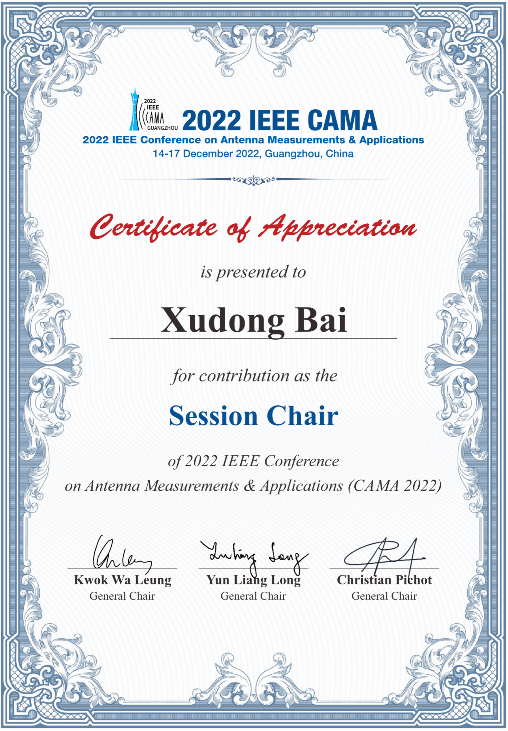 白旭东老师除日常的科研工作外,还积极参与各类公共服务工作,在ement & Application (2022 IEEE CAMA)上担任了分会场Reconfigurable Metamaterials / Metasurfaces and Applications主席,并做了题为《Dynamic Beam-Scanning Through Radiation-Type Programmable Metasurface》的学术报告。同时,积极参与学院的各类项目申报、人才引进、招生等各项工作。