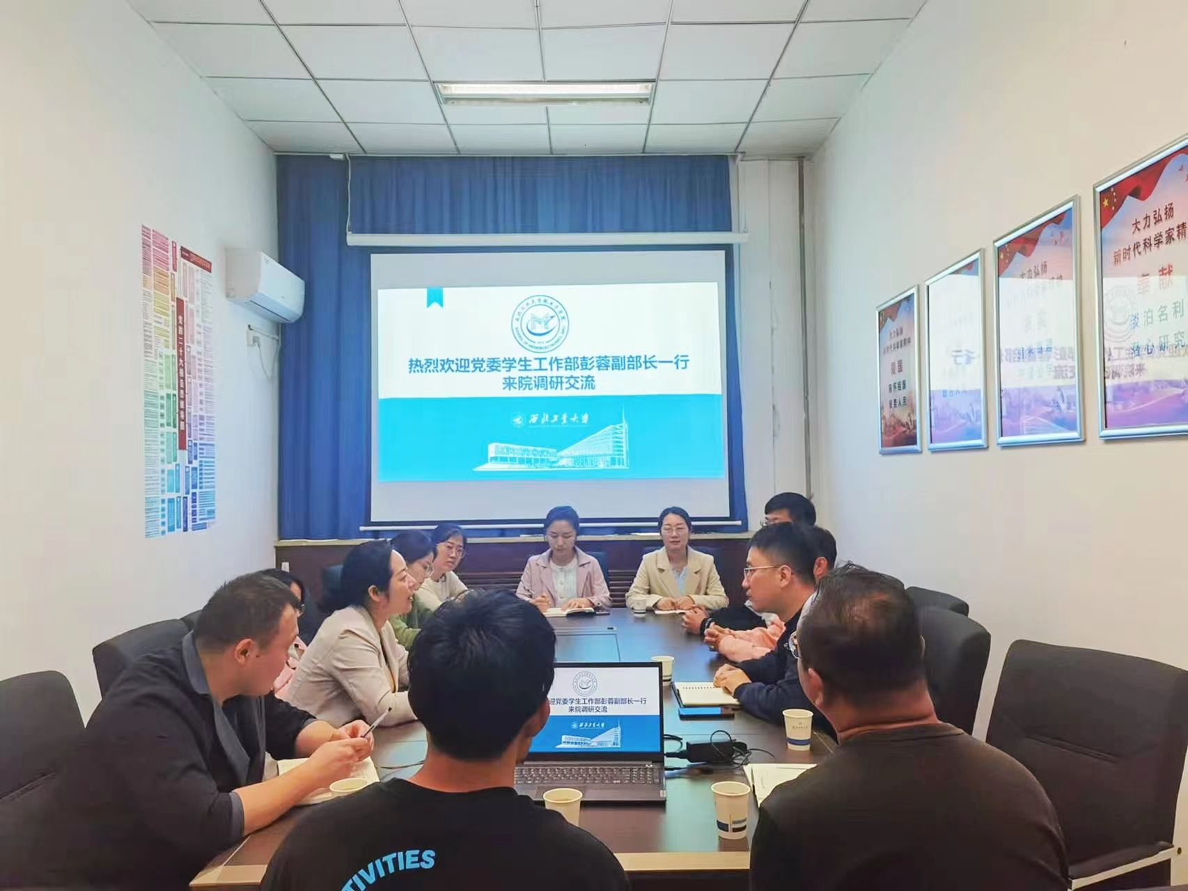 调研开始,彭蓉介绍了本次调研工作的目的,指出学生思想政治工作在办学过程中的重要作用,强调要通过孕育校级标杆团体,创新党建思政工作方式,将意识形态工作贯穿工作全过程、各环节。