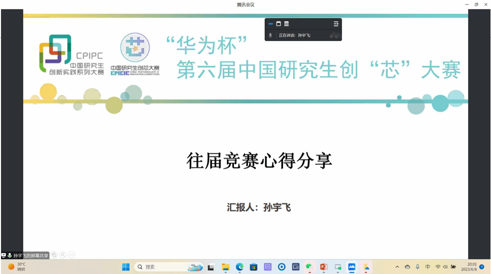 会议还邀请到了往届优秀参赛学生介绍参赛经验和心得,曾获得第四届大赛全国二等奖、第五届大赛全国三等奖的孙宇飞博士强调,比赛初赛环节PPT制作时,需要注意突出作品优势与创新点,能够吸引眼球,同时注意原理部分叙述逻辑清晰,描述清楚,并且提供充分的实验结果来体现作品工作量与进展。更需要注意的是,提交技术文档时要注意格式规范,并且要对整个作品做出更加详细的说明;在复赛环节中,上机考试要做好考前安排和时间分配,需要分工明确避免慌乱。