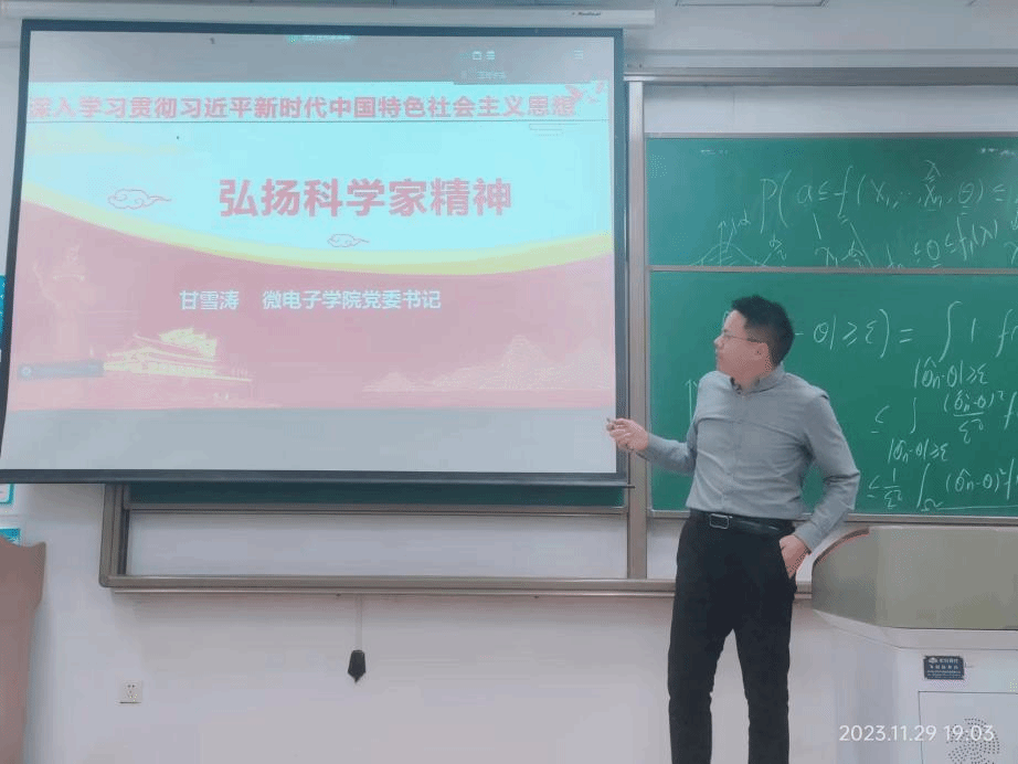 党委书记甘雪涛在教学西楼B203为学院新发展的积极分子、发展对象及党支部书记、支部委员讲授“弘扬科学家精神”主题思政课。