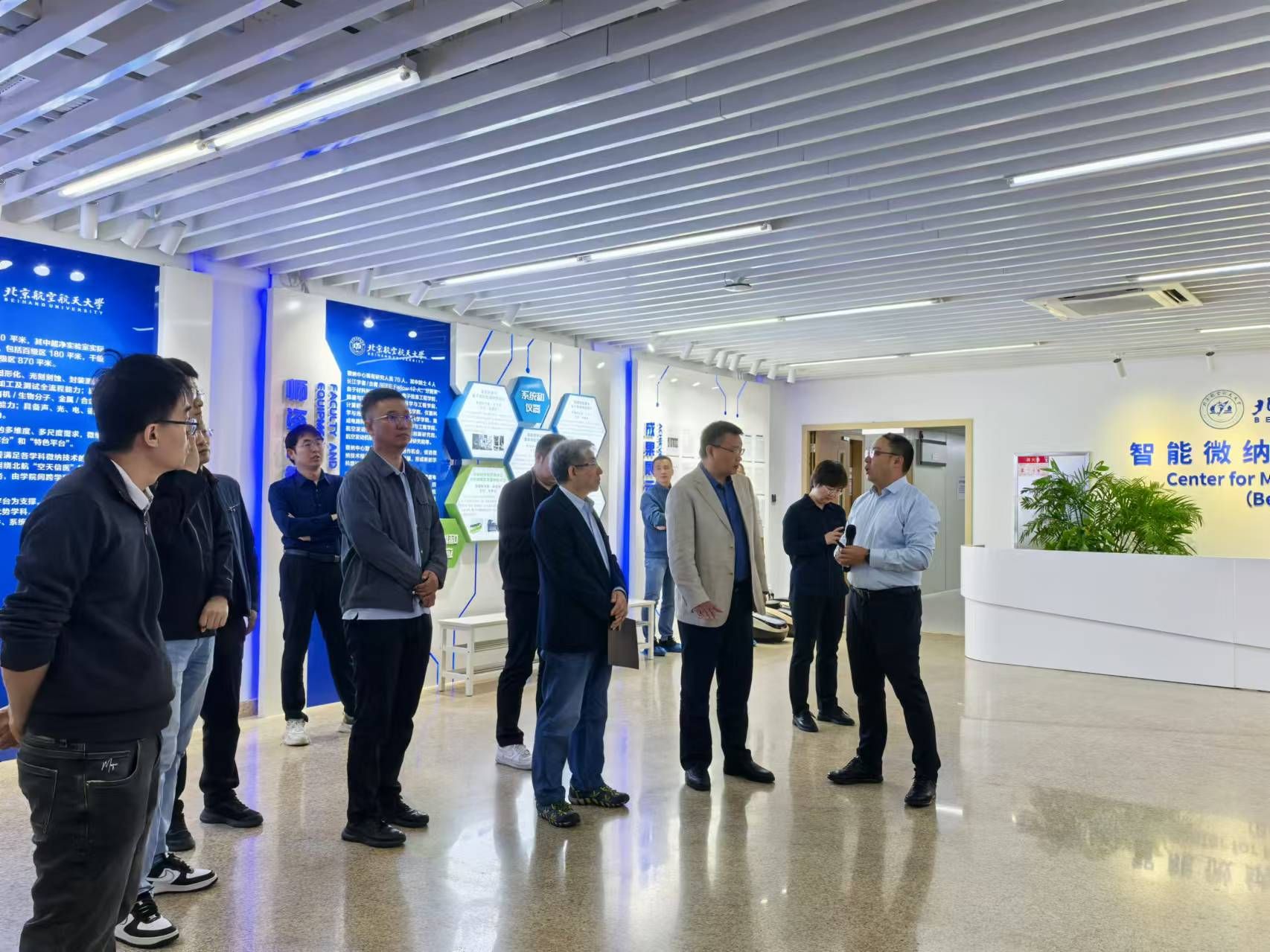 座谈结束,张悦带领参观了北航智能微纳公共创新中心,深入浅出地讲解了创新中心发展的历程以及取得的科技创新成果,参与人员了解了创新中心的通用平台和特色平台的功能,学习了薄膜沉积、图形化、光刻刻蚀、封装测试、性能表征等微纳加工及测试全流程人才培养经验。