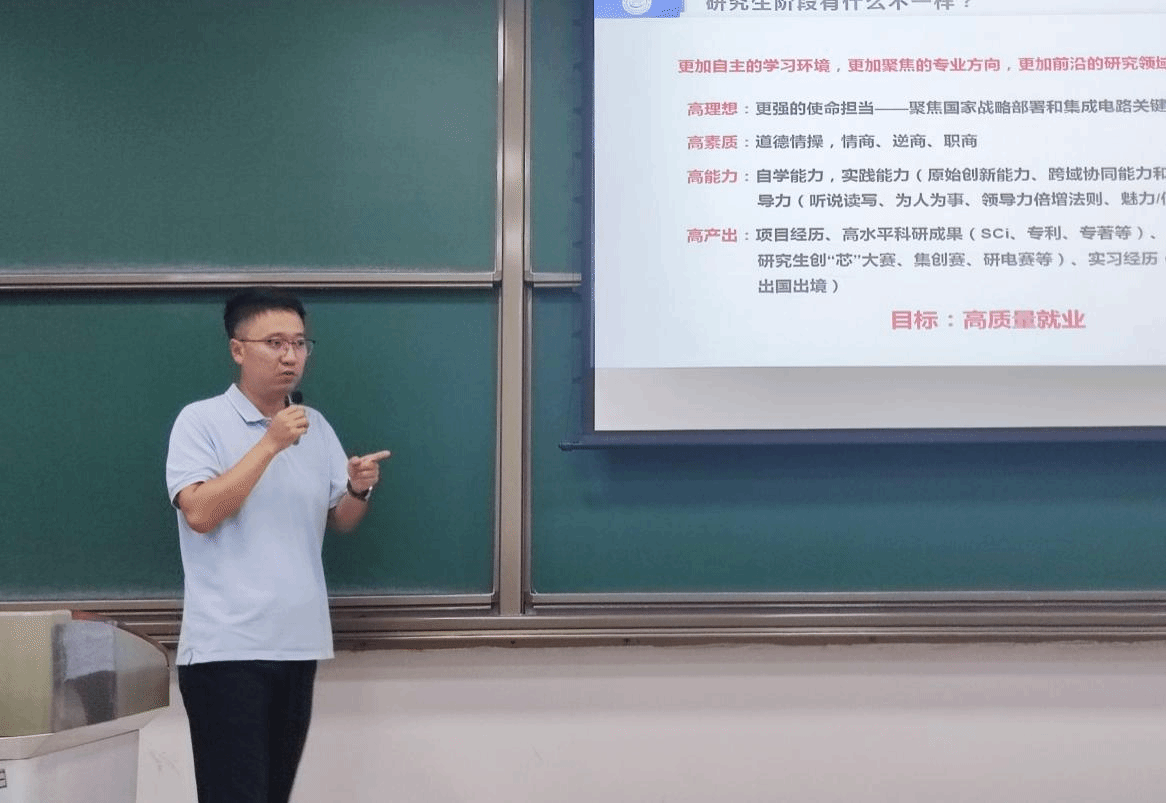 最后,余鹏围绕“如何高质量度过研究生生涯”进行讲解。他指出,研究生阶段具有学习自主性强、专业方向聚焦、研究内容前沿等特点,期望同学们努力成长为具有高理想、高素质、高能力、高产出的优秀人才。他特别强调要与导师保持良好沟通,建议新生主动适应导师指导方式,提升沟通能力,建立高效的协作关系。在安全和纪律方面,他要求大家严守实验室规范,杜绝高危活动,注意网络言行,坚决抵制不良信息和违法活动。他还建议同学们保持积极心态、克服拖延,制定清晰的科研目标,学会主动争取资源和发展机遇。最后他表示,学院学工队伍将持续为同学们提供全方位支持,并鼓励大家积极参与学生工作,共同营造互助共赢的学术氛围。