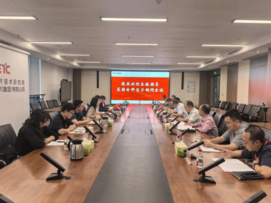 一行参观了电科芯片展厅,了解芯片领域的核心成果。电科芯片院科技市场部副主任彭松、集团首席专家付晓君陪同调研,彭松主持了座谈会。